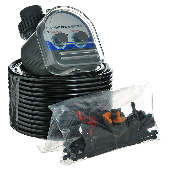 Базовая система включает все необходимое для организации подпитки растений. Подключите набор к бочке или другому резервуару с водой, и микрокапельный полив сделает свое дело. Такая система сэкономит до 70% воды и направит поток к корням растений.